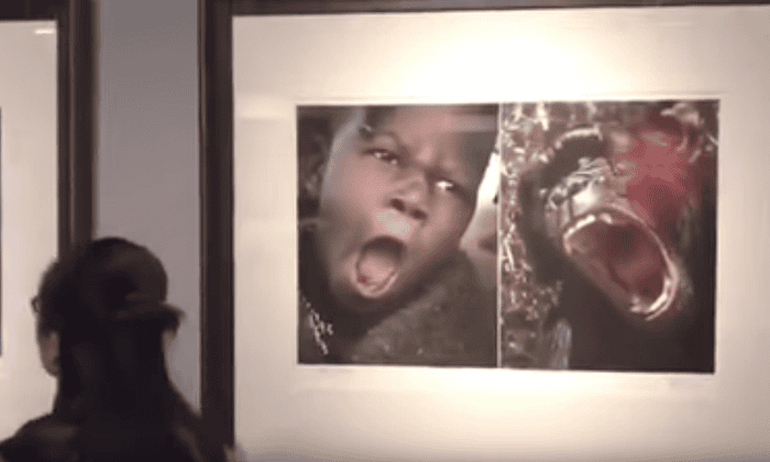 A photo of an African boy and a gorilla by Yu Huiping in an exhibit in China.