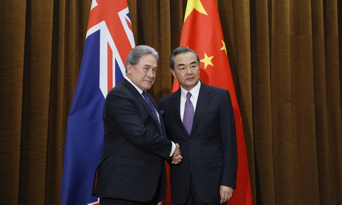 China’s foreign minister Wang Yi shakes hands with New Zealand’s foreign minister Winston Peters in Beijing on 25 May.